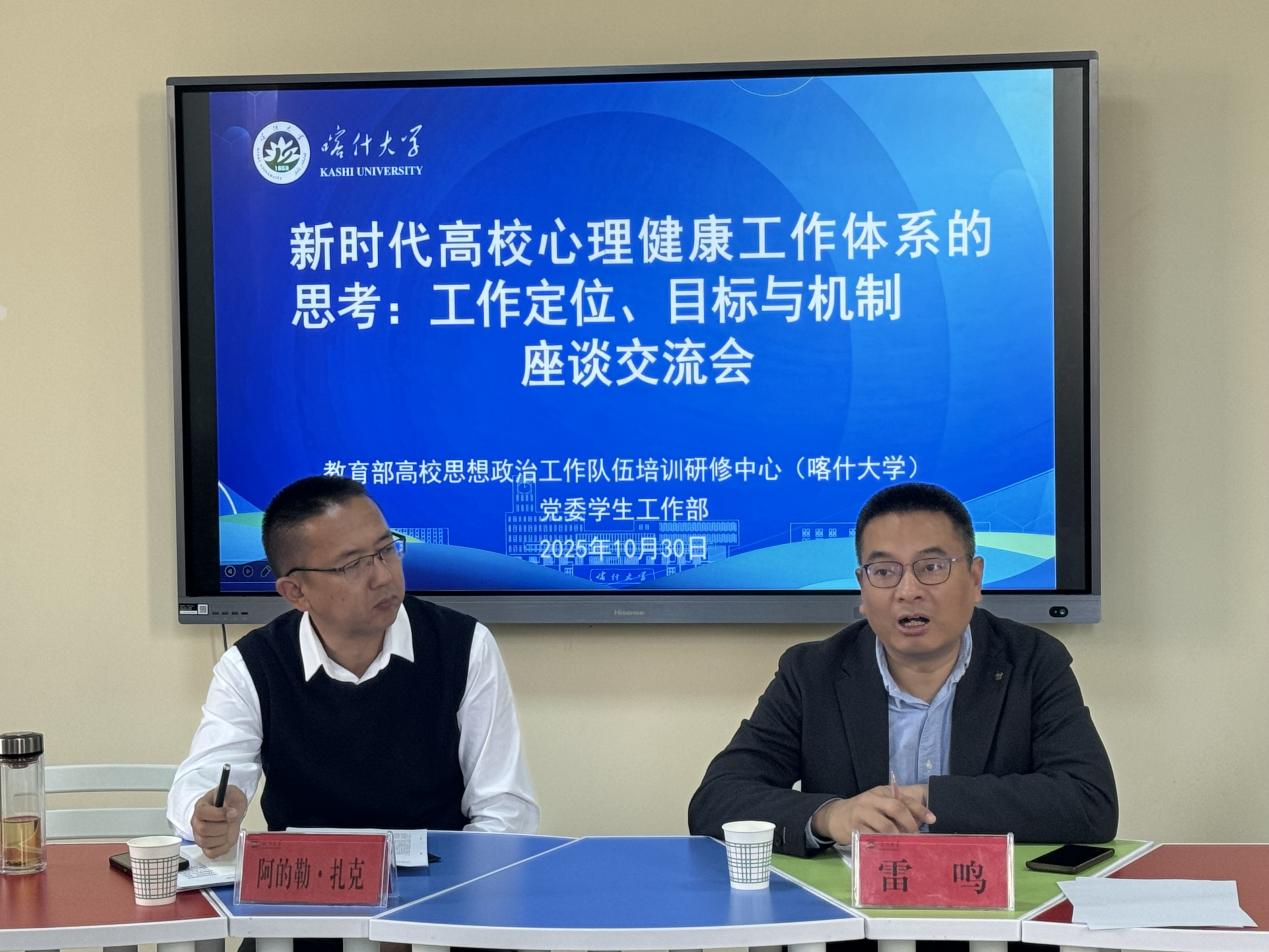 副主任、四川省心理健康教育名师工作室(“正心”工作室)主持人雷鸣应邀为喀什大学心理健康教育专兼职教师、辅导员、心理委员、宿舍长等人员开展讲座和培训,助力提升喀什大学心理健康工作水平。培训和讲座由喀什大学党委学生工作部副部长阿的勒·扎克主持。
