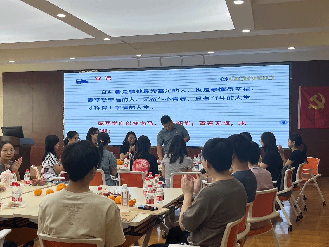 刘书记、孟书记、支部书记樊菊和毕业班辅导员李艳老师与全体毕业生党员围桌而坐,与大家亲切交谈,向各位毕业生分享人生经历、交流工作经验、征集对午夜av