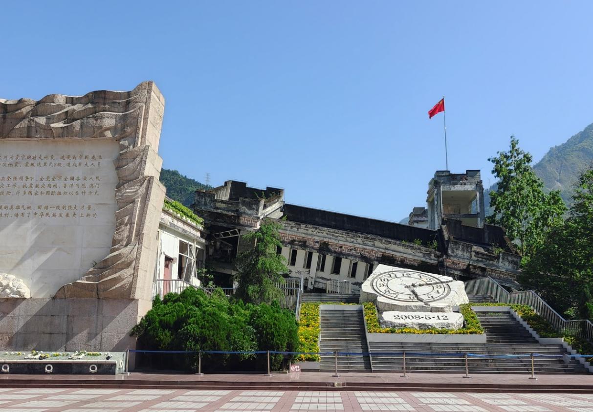 一行抵达映秀镇,首站便是映秀中学遗址。广场正中央的 “汶川时刻” 纪念钟,支离破碎,时间永远定格在 2 点 28 分,它不仅记录着灾难发生的瞬间,也承载着无数人的回忆与缅怀。在庄严肃穆的氛围里,大家整齐列队,为地震中罹难的同胞和英雄们默哀,随后敬献花束,寄托无尽哀思。随后在讲解员的引导和讲解下,同学们了解到了映秀震中纪念馆的情况,给同学们开启了一堂沉重而意义深远的思政课:“5·12”汶川特大地震记录了中国人民在灾难面前的无畏和坚强,也展现了中国共产党在灾难面前的领导和担当,值得我们永远铭记和传承,映秀震中纪念馆内复刻的地震惨烈场景以及抗震救灾全过程,详细展示了国家在灾难面前的迅速反应与全力救援,各方力量的无私奉献,彰显了国家对人民生命安全的高度重视与坚定守护,“一方有难,八方支援” 的力量深厚也在此刻得以生动体现。