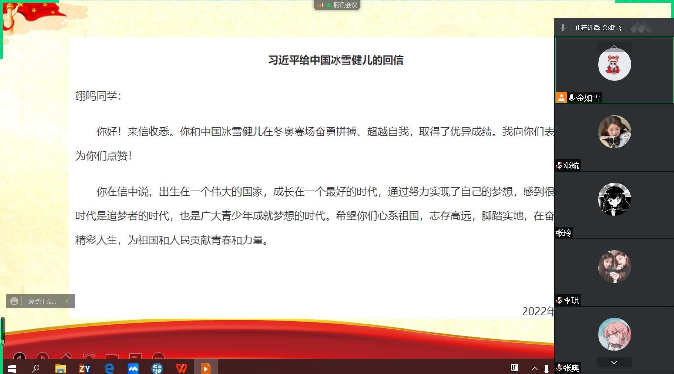 本次团课学习重点为习近平总书记在2022年春季学期中央党校(国家行政学院)中青年干部培训开班式上的重要讲话精神,同时还学习了冬奥会的相关内容,如习近平总书记给中国冰雪健儿的回信。