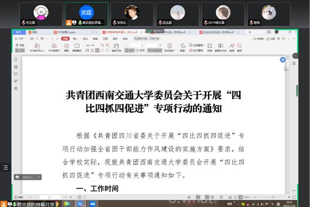 2022年7月28日19:00,为积极响应“四比四抓四促进”专项行动,深入学习贯彻习近平总书记在庆祝中国共产主义青年团成立100周年大会上的重要讲话精神,心理2019-01班团支部开展了关于习近平总书记系列重要讲话的线上学习会。
