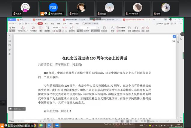 首先,团支书黄奕莛带领同学们重温了习近平总书记在庆祝中国共产主义青年团成立100周年大会上的重要讲话,学习100年来共青团坚定不移听党话、跟党走的青春历程,让同学们深刻理解了共青团和青年工作的历史经验以及作为青年的责任与担当。然后,团支书黄奕莛还与同学们一同回顾习近平总书记在纪念五四运动 100 周年大会上的讲话,进一步明确了作为中国青年的前进方向,为真正成为社会主义的合格建设者和可靠接班人做好准备。
