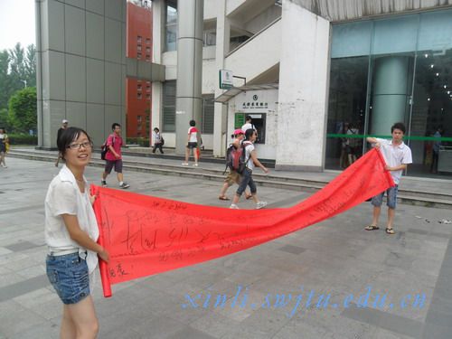 上午11:00,分配在三,四食堂的两个小组,分别在罗欢欢和辛先芬同学的安排下紧锣密鼓的进行布置:摆放桌子,张贴海报,准备红色签字布幅······在12:00左右,负责宣传的裴栋,严颖,王婷,黄之恒不顾炎日当头,热情地向同学们宣传。活动立刻得到同学的广泛参与,大家纷纷拿起手中的笔在横幅上写下自己真挚的祝福。由于同学们的热情度太高,人数众多,许多同学无视火热的太阳在旁边耐心等候。仅仅20分钟左右,事先准备好的两个横幅已经满是祝福,同学们的祝福布满横幅的每一个角落。由于大家超高强度的参与,原本计划一天的活动,仅仅在几十分钟内完美落幕。青协陆艳红幽默说道:“在大的横幅也写不下交大学子对母校的祝福。”所有志愿者满脸笑意。