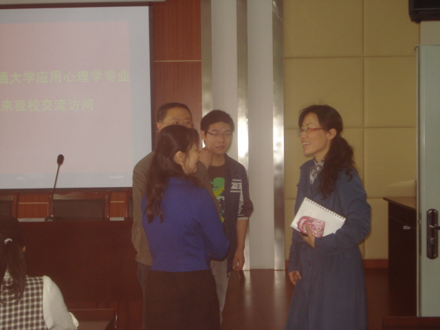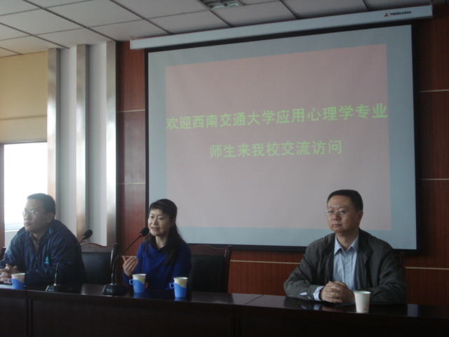 师生简要介绍了西南科大应用心理学专业的开展状况,自2006年招生开始,每年约招收60名新生,如今西南科大应用心理学系已有240多名学生。西南科大应用心理学系隶属法学院,将心理学与法学紧密结合,突出犯罪心理学研究优势,积极与绵阳市警察局、监狱等展开合作,进行警察心理干预,研究犯罪心理学。学院还建立了心理学实验基地,与绵阳市公检法系统,以及各中小学展开合作。进一步建立心理学研究平台,争取设立硕士点,促进心理学的学科发展是专业未来的发展方向。