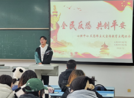 为持续提升大学生群体识恐、防恐、反恐的意识和能力,创造安全稳定的校园环境,2023年12月15日14:00在X2526开展“全民反恐 共创平安”反恐怖主义宣传教育主题班会。本次班会由班级安全委员谌龙同学主持,午夜av 2022级本科生全体同学参会。