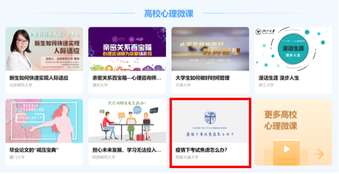 高飞和冉俐雯两位老师负责的《疫情下考试焦虑怎么办?》首批入驻“精品课程”、“心理微课”板块。