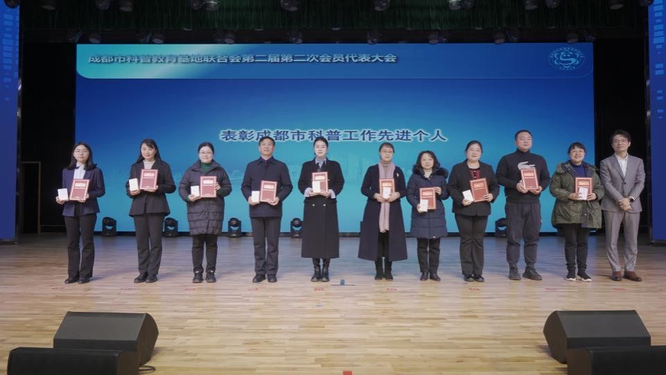 科普基地参加会议。会员代表大会通报了2023年工作和财务报告、2024年工作计划和财务预算,表彰了成都市科普工作先进个人、先进集体、优秀科普志愿者及队伍,为第二批成渝地区标准化科普研学基(营)地授牌。唐静老师作为2023年度成都市科普工作先进个人上台领奖。