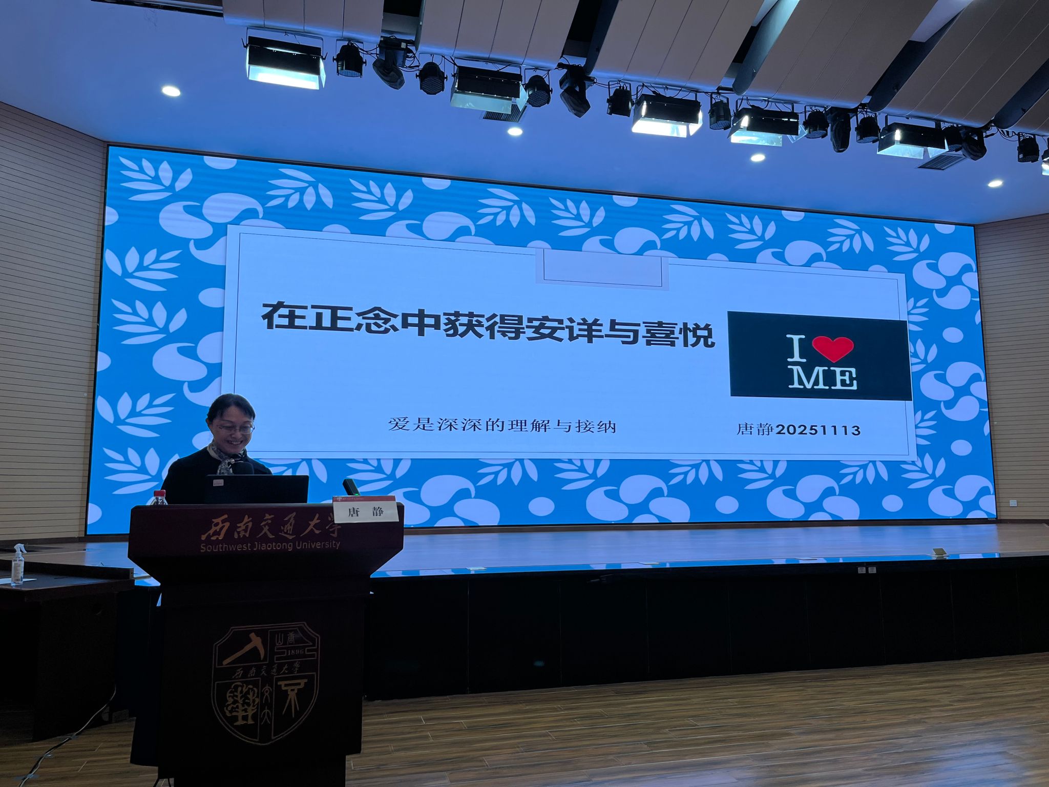 本次活动以《在正念中获得安详与喜悦》为主题,唐静老师首先通过静心小练习引导大家领悟:爱自己的深层境界,是敞开心扉、为内心的脆弱留出温柔的空间。随后,她结合案例分享正念学习的体会,系统讲解了正念的内涵、修习正念的意义及实用方法,并带领现场教职工体验了“正念吃葡萄干”的沉浸式练习,还组织大家共同朗诵小诗《我允许》,最后推荐了相关优质书籍。
