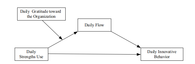本研究认为,优势使用在每一天的工作中存在不同且有较大的波动,并且又会通过影响员工每日的情绪认知状态,最终影响个体每日创新行为的动态变化。为进一步探究其中的机制及边界效应,也就是揭示优势使用如何、以及什么时候会影响创新行为,研究提出以每日心流(Flow)作为中介变量—Flow反映了一种随工作时间和工作情境动态变化的最优体验,它是一种全身心投入、物我两忘的极度愉悦的心理状态,它能够积极影响员工的创造性绩效。研究以每日对组织的感恩(GTO)作为调节变量。一个对组织越是感恩(GTO)的员工,他们的自主性越强、倦怠越少,工作满意度越高。
