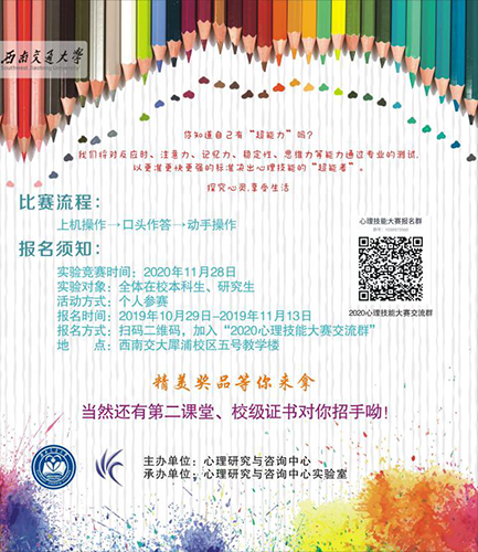 你知道自己有“超能力”吗?我们将对反应时、注意力、记忆力、稳定性、思维力等能力通过专业的测试,以更准更快更强的标准决出心理技能的“超能者”。探究心灵,享受生活比赛流程:上机操作 → 口头作答 → 动手操作报名须知: 实验竞赛时间:2020年11月28日 实验对象:全体在校本科生、研究生活动方式:个人参赛报名时间:2019年10月29日-2019年11月13日报名方式:扫码二维码,加入“2020心理技能大赛交流群”地 点:午夜av 犀浦校区五号教学楼精美奖品等你来拿当然还有第二课堂、校级证书对你招手呦!主办单位:午夜av 承办单位:午夜av 实验室