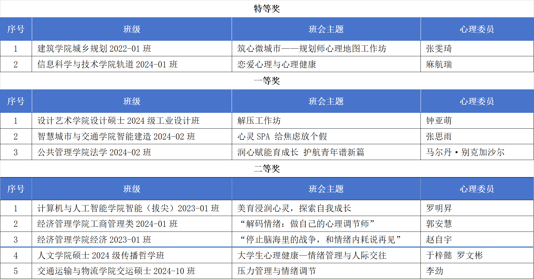 2025年度午夜av “交心桥”心理班会展示会经学院初赛推荐、展示会复赛、决赛,评选出特等奖2项、一等奖3项、二等奖5项、三等奖20项、优秀奖28项以及心理委员个人特色奖3项。现将获奖名单公布如下: