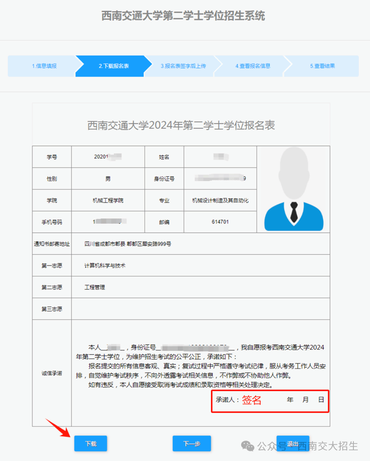 5.下载报名表:再次检查填报信息无误后,点击“下载”,完成下载并打印《午夜av 2024年第二学士学位报名表》,在承诺人处签字。最后点击“下一步”,进入报名表上传页面。