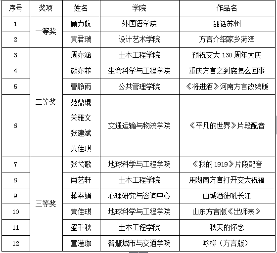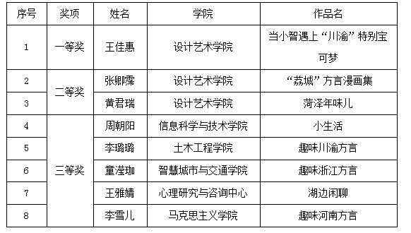 根据比赛安排,经组织评审,方言视频赛道共评选出一等奖2名、二等奖4名、三等奖6名,漫画赛道共评选出一等奖1名、二等奖2名、三等奖5名。现将获奖名单公布如下: