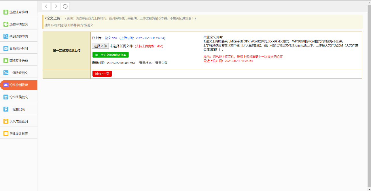 在论文检测管理中—提交论文信息—上传论文(第一次检测)—选择文件—第一次论文检测确认查重—下载报告进行修改—第二次论文检测(论文查重率低于30%,AIGC检测率低于30%方可答辩,请谨慎上传)。