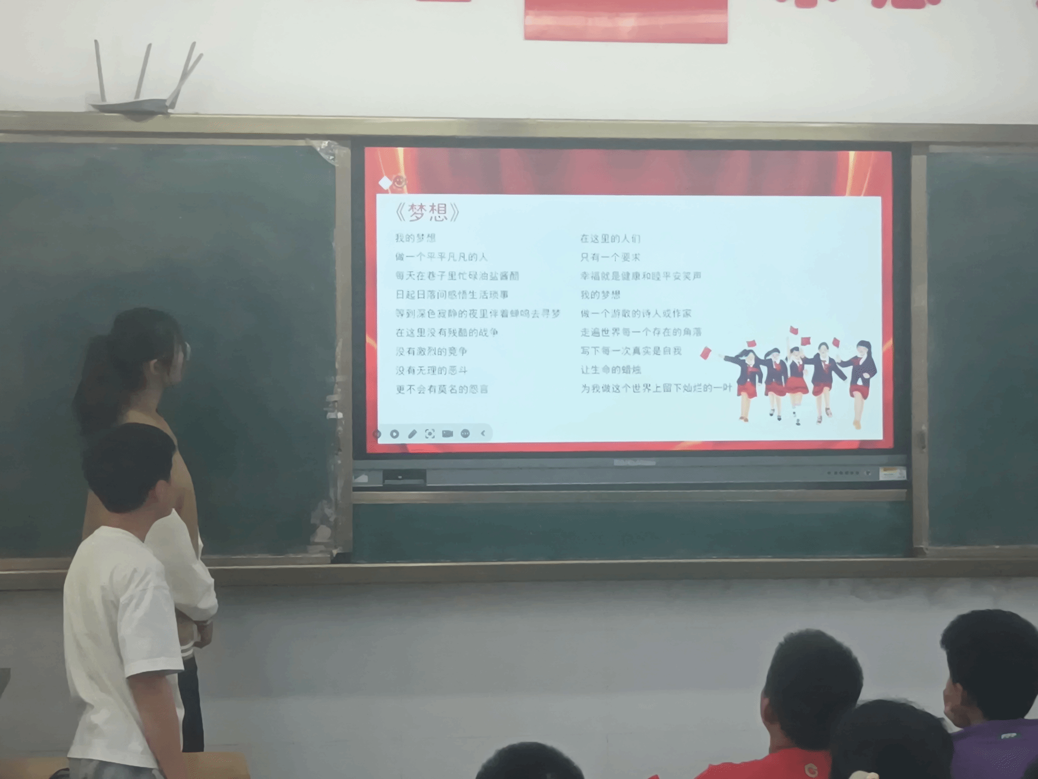 本次课堂以诵读关于梦想的诗歌作为先导。“我的梦想......写下每一次真实是自我让生命的蜡烛,为我做这个世界上留下灿烂的一叶”同学们用饱含着深情的语气朗读着诗歌,在朗朗的读书声中,他们或有迷茫,但已经对梦想和爱国有了感性的认识。而老师也顺势抛出“梦想是什么?”“人为什么要有梦想?”等问题,引发了同学们的积极讨论。