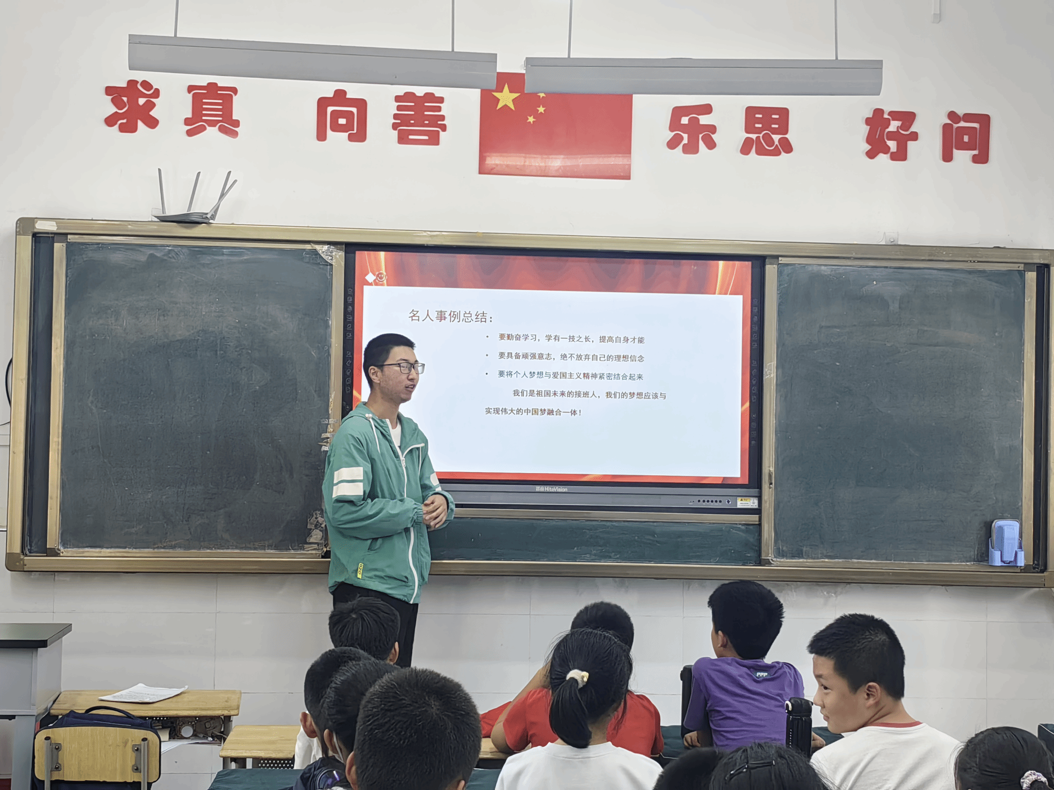 随后,为了向同学们讲解如何实现梦想,老师向同学们讲述了杨靖宇烈士、茅以升先生以及袁隆平先生各自的梦想与实现的途径。同学们不仅听得十分认真,从名人事迹中学到了很多优良品质,还明白了要把个人梦想与伟大的中国梦相结合。
