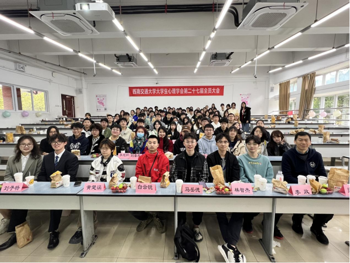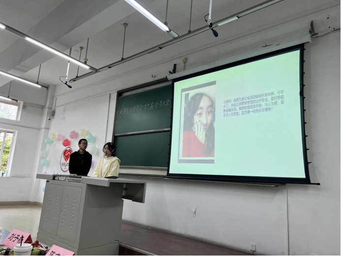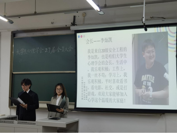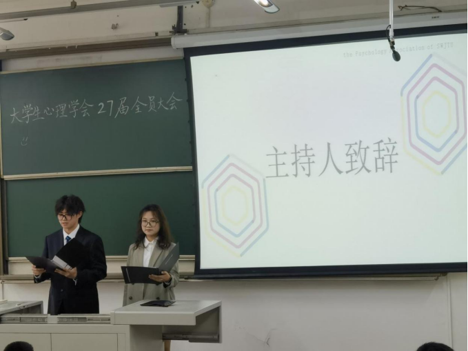 犀浦校区1212教室召开,此次参会人员是大学生心理学会全体成员,主持人是活动部的李天成和学术咨询部的左优莉。