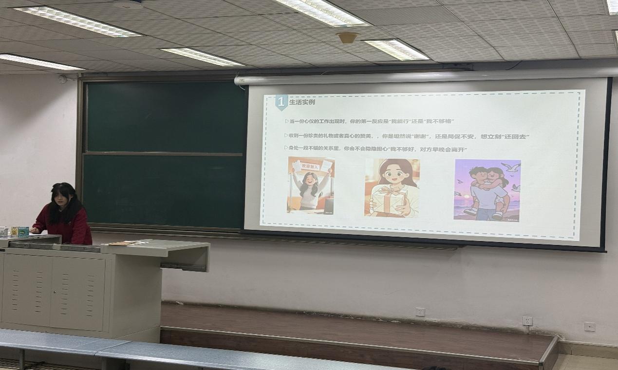 “明明有能力争取机会,却下意识退缩;收到认可第一反应是否认,觉得只是运气;就连接纳他人善意,都心怀忐忑想着回报……”这些藏在日常里的内耗,本质都是配得感不足的表现。为帮助同学们打破“我不配”的心理枷锁,大学生心理学会于11月21日在X1215教室举办朋辈心理支持系列活动,主讲人周淮玉同学以理论解读+差异对比+实用方法的形式,深入浅出拆解配得感的自我肯定逻辑。