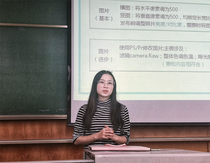 首先培训的内容的是新闻稿的写作规范,培训的主讲人是来自心传媒文案部的副部长吴一琳,她分别从写作格式和注意事项两个方面展开了介绍。第一部分中,吴同学从新闻稿的写作要求、标题的拟定、叙述活动的方式、新闻中照片的拍摄和处理、结尾部分的要求等几个方面进行了详细的讲解。在第二部分的注意事项中,吴同学借用一篇新闻稿,对出席人员介绍方式、连词的使用方式、标点符号的注意事项等容易出错的方面进行了强调。