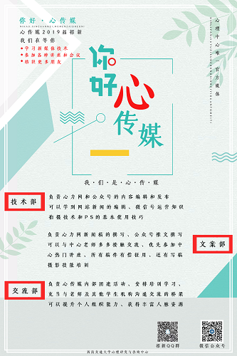 4. 其他学院的朋友若对心传媒或者心理健康感兴趣,可以通过向公众号投稿的方式参与心传媒的工作(公众号:xlyjyzxzx)。