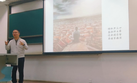 王老师首先向师生展示了一幅画,并询问了在场同学和老师看到它的感受。对于同一幅画,有人看到了压抑、拥挤与暴风雨;有人看到了自由、空旷和“一览众山小”的怡然。王老师由此指出艺术是人类心灵的投射,我们不仅可以借助艺术的这种特性来推断出人的心理状况(例如后面提到的著名的罗夏墨迹测验与房树人测验),也可以通过艺术天然的疗愈作用来达到心灵减压的效果。