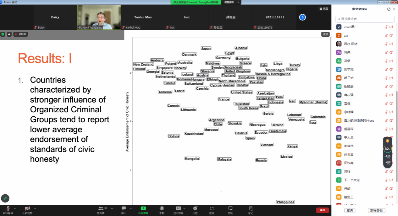 紧接着,Travaglino教授介绍了相关研究的研究方法,介绍了公民诚实度的测量、有组织犯罪集团的社会影响的量化指数测量、对国家机构政治和法律权威信任的测量主体以及有可能对因变量变化产生影响的协变量,并展示了WVS/EVS对83个国家公民诚实得分的平均值,构建了多层次结构模型,结果发现,有组织的犯罪集团的影响力越大,公民的平均诚实度就越低,犯罪集团的影响改变了国家机构信任和公民诚实之间的关系,犯罪集团的影响在国家机构信任和公民诚实之间有调节作用。最后,Travaglino教授指出,影响公民诚信和国家制度信任关系的影响因素还有很多,例如人际信任,未来的研究可以在相关方向进行拓展。