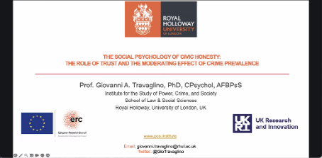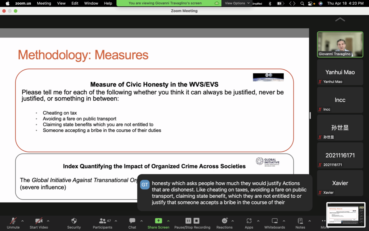 讲座正式开始,Travaglino教授首先围绕公民诚信的概念,探讨个体对国家机构的信任程度如何影响公民诚信的实践。Travaglino教授指出,公民诚信指的是公民对诚信标准的承诺,他们避免腐败、逃税和福利欺诈等行为,因为这些行为被视为道德上的错误。Travaglino教授介绍了有组织的犯罪集团对社会带来的消极影响,包括经济方面、生命安全和消极的社会影响,而且这种消极影响正在威胁全球各个国家的利益,这种犯罪集团在全球范围内广泛分布。