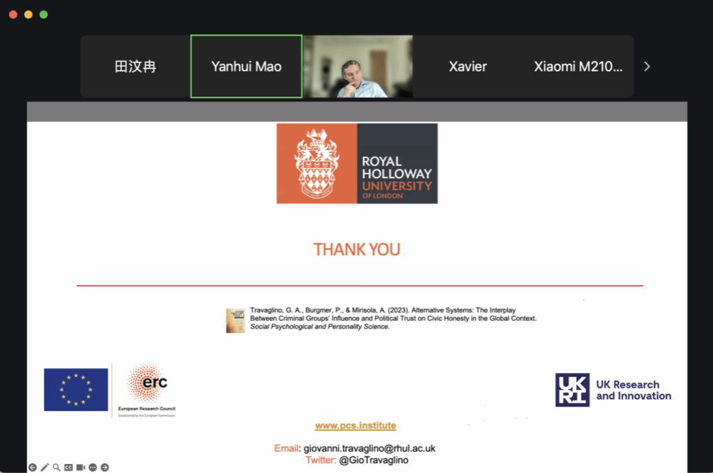 此次讲座不仅将为参与者提供关于公民诚信与信任之间关系的深刻见解,还探讨了有组织犯罪集团如何影响社会的心理层面原因。Travaglino教授的研究成果将对理解公民诚信在不同国家背景下的表现提供了新的视角,并为未来的研究方向提供启示。参与者表示本次讲座开拓了自己的眼界,对自己未来的研究有新的启发。