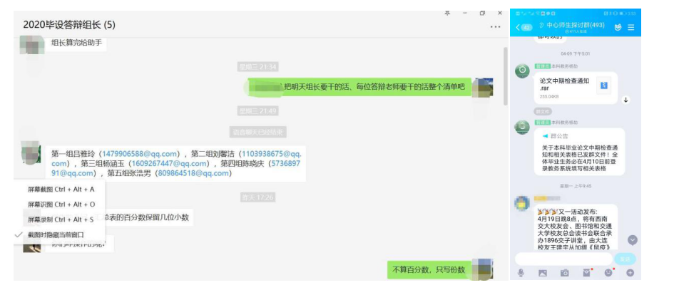 中期检查答辩会开始之前,本科教研室通过微信群,召集各组组长共同商议中期检查工作。摸清了各组学生的毕业论文完成的大致情况,讨论了需要集体商议的共性问题并做了应急预案,明确了中期检查的重要环节和流程。本次中期检查全部通过ZOOM会议平台进行检查。