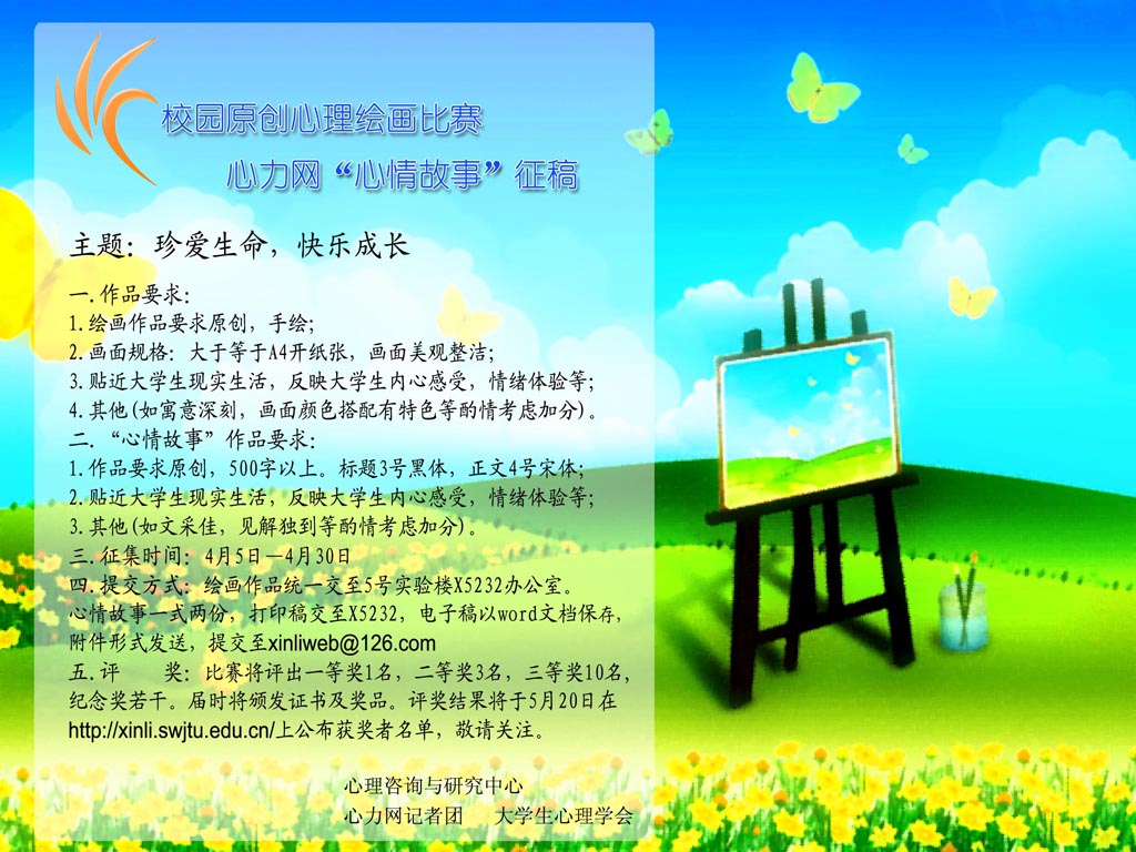 五、评奖:比赛将分别评出一等奖1名,二等奖3名,三等奖10名,纪念奖若干。届时将颁发证书及奖品。评奖结果将于5月20日在“心力网”上公布获奖者名单,敬请关注。