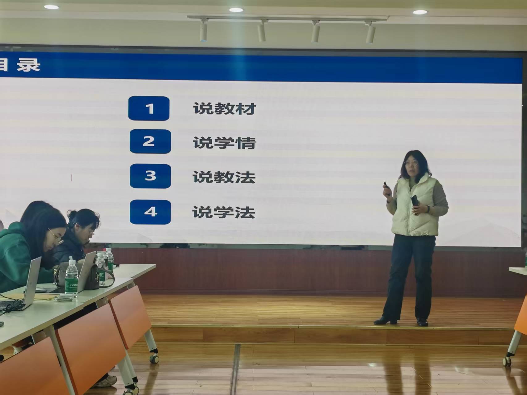 何立群、杨兴鹏两位老师围绕教材第二章《发现自我 实现自我》开展说课,展示在这一章中对教材、学情的分析以及教法的选择、学法引导的思考,两位老师还讲解了在这一章中的授课思路、PPT制作方法、活动设计。