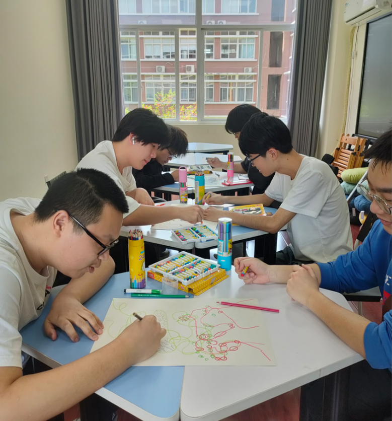 教师高飞带领6位同学通过绘画建立人际联结。本次活动旨在通过表达性艺术治疗技术,引导参与学生在绘画互动中体验非语言沟通的魅力,促进同学在人际间的温暖联结。