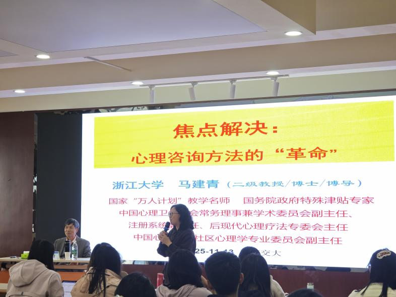 本场讲座既展现了焦点解决的理论创新,又通过互动体验深化了理解。马教授将理论解析与现场参与有机融合的讲授方式,赢得了师生的一致好评,为在座者在专业实践与个人成长中运用这一方法提供了扎实基础。