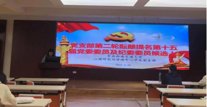 心理午夜av 学生党支部于2022年3月24日14:00在x5501召开支部大会。大会主要内容有三项,分别是党支部第二轮酝酿提名党委委员及纪委委员候选人、预备党员转正以及心理午夜av 学生党支部优化调整的报告。本次支部大会由学生党支部书记赵海琳主持。
