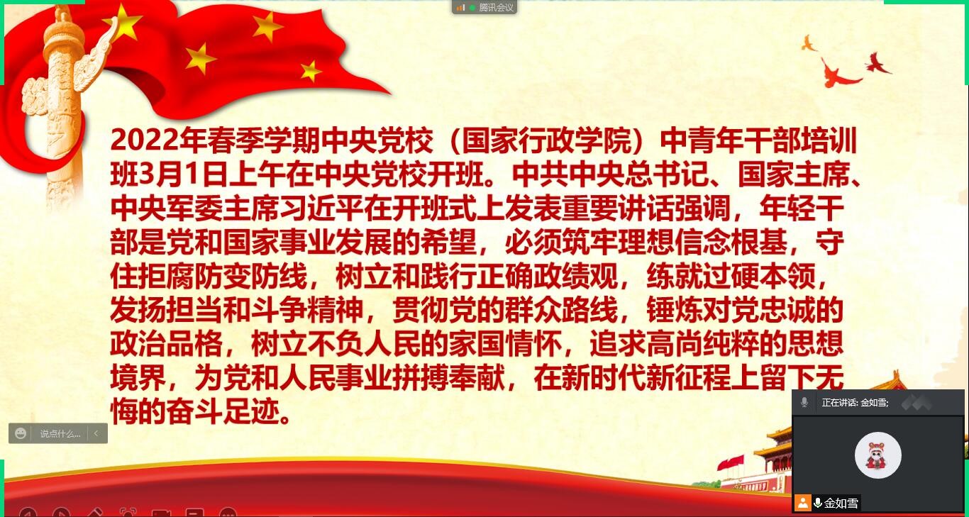 本次团课学习重点为习近平总书记在2022年春季学期中央党校(国家行政学院)中青年干部培训开班式上的重要讲话精神,同时还学习了冬奥会的相关内容,如习近平总书记给中国冰雪健儿的回信。
