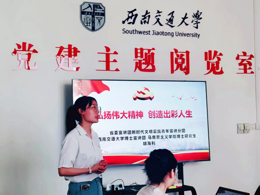 在微党课的讲授中,胡海利同志以四川省和交大作为切入点,从新民主主义革命时期、社会主义革命和建设时期、改革开放和社会主义现代化建设新时期以及中国特色社会主义新时代选取了四个精神,结合生动感人的事迹进行了讲述。她强调,我们党员应该弘扬伟大精神,做有理想、敢担当、能吃苦、肯奋斗的新时代好青年,让青春在全面建设社会主义现代化国家的火热实践中绽放绚丽之花。