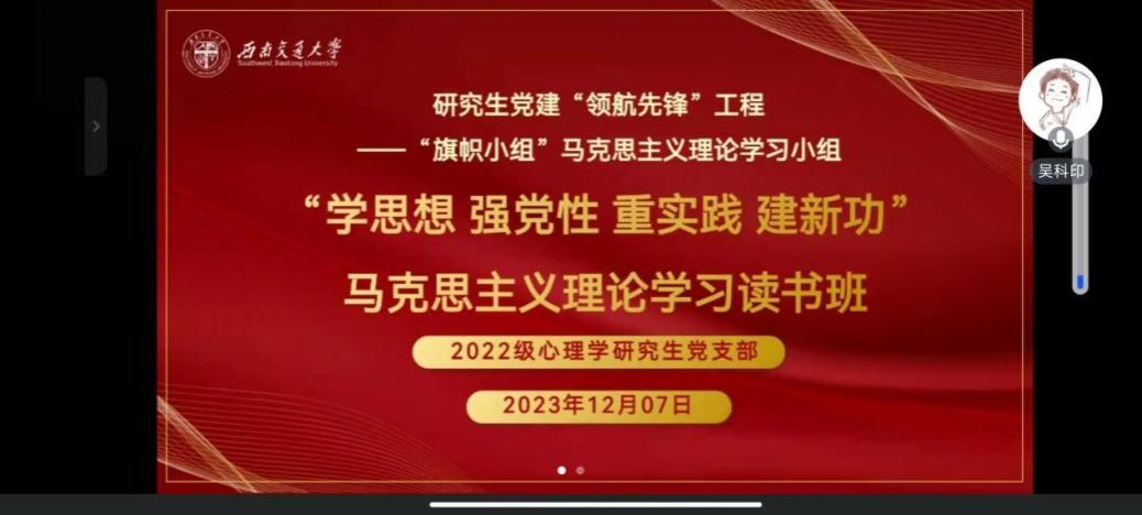 为不断加强党员与入党积极分子马克思理论知识素养,提升党性观念与为人民服务意识,2023年12月7日晚20:00-21:00,2022级心理学研究生党支部组织开展了“学思想 强党性 重实践 建新功”马克思主义理论学习读书班第二次活动。此次学习活动由党员同志兼学习委员吴科印主持,全体党员、发展对象及入党积极分子参加。