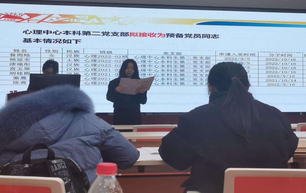 本科生第二党支部于2023年12月15日下午16时30分在X5501召开了支部大会,讨论关于接收昝雨晗、候延宏、漆瑜彤、胡桂榔、陈茜、宫玉翠、秦晨等七名同志为中共预备党员事宜。参加此次会议的有心理午夜av