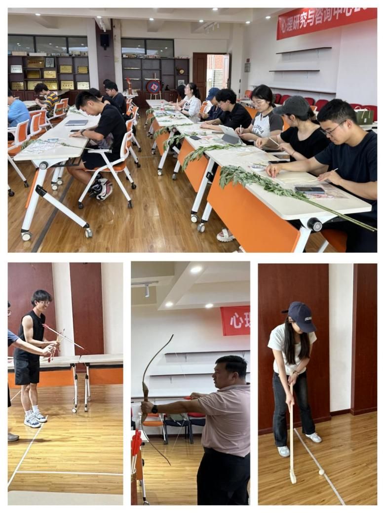 本次活动共设立竹编小船、投壶、捶丸、木射、射箭五个环节,所有环节完成后还可以领取小奖品。每逢端午佳节,家家户户门前挂起翠绿的艾草,不仅是为了驱邪避害,更是寓意着生活的平安与健康,绿意盎然中透露着人们对美好生活的向往。一只只竹编小船,搭配些许艾叶,承载着人们对美好生活的祈愿。在进行正式活动前,由志愿者为同学们讲解了每一项活动的玩法以及活动来源等。大家跃跃欲试,试图在活动中大显身手,过程中相互交流,现场气氛其乐融融。大家认为在本次活动中收获了许多的欢乐,还体验到了中华传统文化的魅力与内涵。