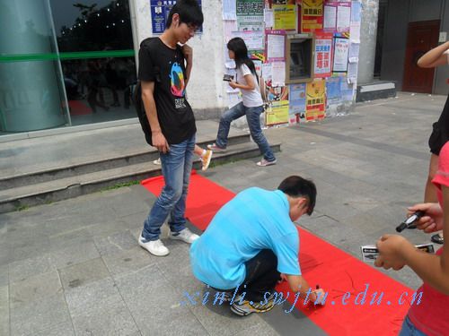 上午11:00,分配在三,四食堂的两个小组,分别在罗欢欢和辛先芬同学的安排下紧锣密鼓的进行布置:摆放桌子,张贴海报,准备红色签字布幅······在12:00左右,负责宣传的裴栋,严颖,王婷,黄之恒不顾炎日当头,热情地向同学们宣传。活动立刻得到同学的广泛参与,大家纷纷拿起手中的笔在横幅上写下自己真挚的祝福。由于同学们的热情度太高,人数众多,许多同学无视火热的太阳在旁边耐心等候。仅仅20分钟左右,事先准备好的两个横幅已经满是祝福,同学们的祝福布满横幅的每一个角落。由于大家超高强度的参与,原本计划一天的活动,仅仅在几十分钟内完美落幕。青协陆艳红幽默说道:“在大的横幅也写不下交大学子对母校的祝福。”所有志愿者满脸笑意。