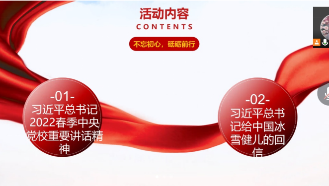 本次专题学习活动由两部分构成,一是学习习近平总书记2022年春季中央党校重要讲话精神,二是学习习近平总书记给中国冰雪健儿的回信。本次活动首先由甘诗源向大家简要介绍了习近平总书记在2022年春季学期中央党校中青年干部培训班开班式上的重要讲话的内容,并强调了习近平总书记对年轻干部寄予的厚望以及对其坚守初心为党和国家作出贡献的希望,由此引导出本次活动的主题“不忘初心,砥砺前行”。随后,在甘诗源的带领下,全体与会者学习了习近平总书记给中国冰雪健儿的回信。