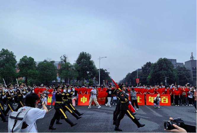 的同学们向他们投去了崇拜与尊敬的目光,大家自发地为国旗护卫队队员们摄像留影,记录着这意义重大的一刻。