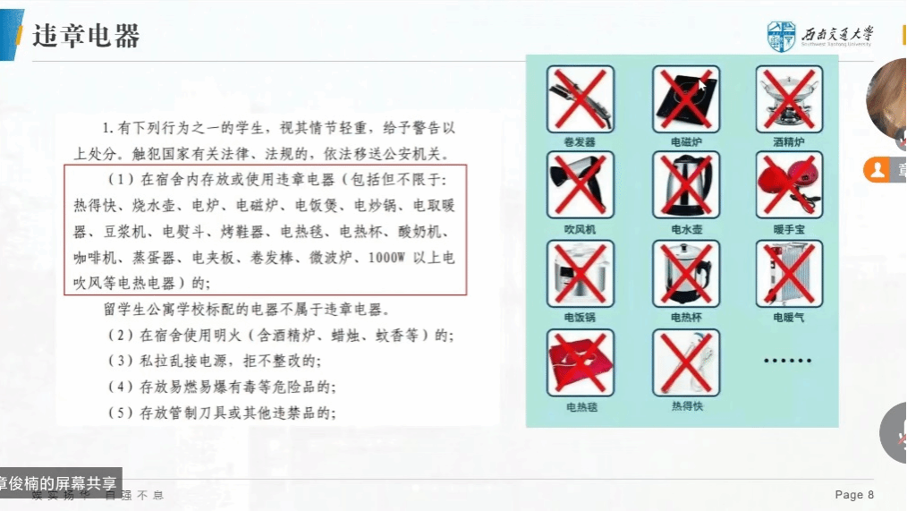 紧接着,就住宿安全方面章俊楠强调了违章电器使用的危害性,并展示了几个因违规使用电器引发事故的真实案例。这些触目惊心的案例使同学们深刻认识到违规使用电器的危害,并意识到遵守宿舍安全管理规定的重要性。章俊楠还向大家介绍了预防火灾的基本措施和应对突发情况的方法,提醒同学们时刻关注宿舍内的电器设备,避免因不当使用而引发意外。
