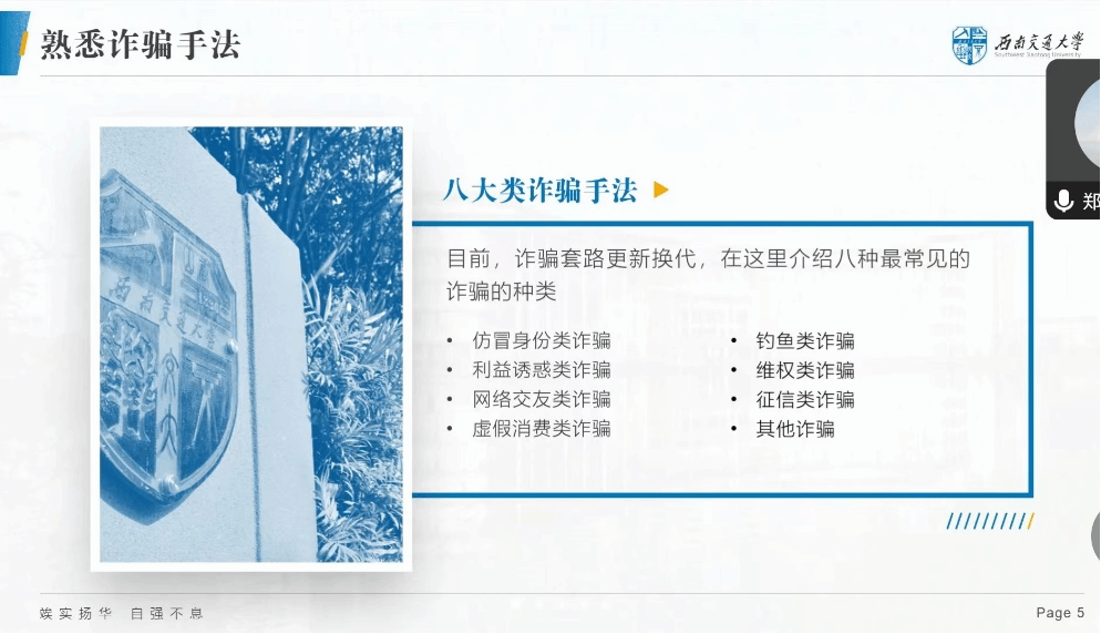 本次班会以安全为主题,涵盖了财产安全和住宿安全两个方面。首先,在财产安全方面, 章俊楠向同学们详尽介绍了当前社会上一些常见的诈骗手段和技巧,并强调了提高反诈骗意识的重要性。她通过实例解析和经验分享,使同学们认识到诈骗的危害性,并提醒大家要时刻保持警惕,切勿轻信陌生人。此外,她还向大家推荐了“蓉城反诈卫士”小程序,这是一个具有实用价值的防诈骗工具,可以对潜在的电信诈骗起到警示和防范的作用。