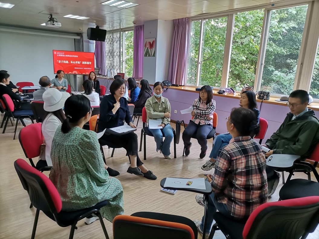亲子沟通是影响家庭关系的一个核心且基础的部分。它既是父母了解子女行为与心理的重要手段,也是影响子女认知和情感发展的重要因素。良好的亲子沟通有利于增加家庭成员之间的亲密程度,对家庭的每个成员的身心健康起到积极的作用。为关心关爱教职工,有效帮助他们化解心理困惑,提高亲子沟通能力,促进家庭和睦和谐,提升职工的幸福感和归属感,校工会与午夜av ,以心灵驿站为依托,邀请汪小容、张涛两位专家,开展“亲子沟通,从心开始”团体心理辅导活动。