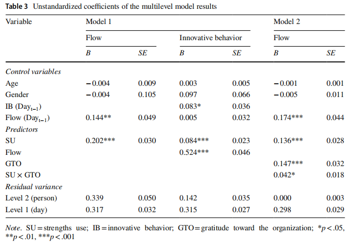 在这项日记法研究中,我们发现工作中的每日优势使用不仅能促使员工产生积极的认知情绪体验(即最优体验,亦称心流体验),还能促进其创新行为。这揭示,员工在日常工作中更多地发挥自身优势可以直接和间接(通过更强的工作Flow)提升日常工作中的创新行为。此外,那些在日常工作中表现出较高水平的对组织感恩(GTO)的员工,在使用自身优势时可能会体验到更强烈的Flow。总体而言,本研究通过追踪个体每日优势使用与每日创新行为在被试内水平上的动态互动,为理解员工如何在组织中展现创新行为提供了新的视角,并为组织中的管理实践提供了有价值的指导。