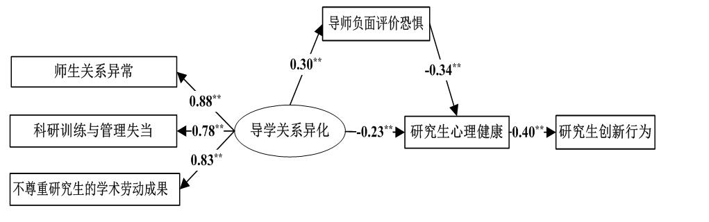 研究团队发现,导学关系异化负向预测心理健康,以及正向预测导师负面评价恐惧。导学关系异化通过导师负面恐惧和研究生心理健康为链式多重中介预测创新行为。研究生导师性别的调节效应显著,较之于研究生与男性导师关系异化,女性导师导学关系异化对研究生负面评价恐惧更具影响力,即女性导师负面评价恐惧的路径系数显著高于男性导师,但研究生性别对模型调节不显著。