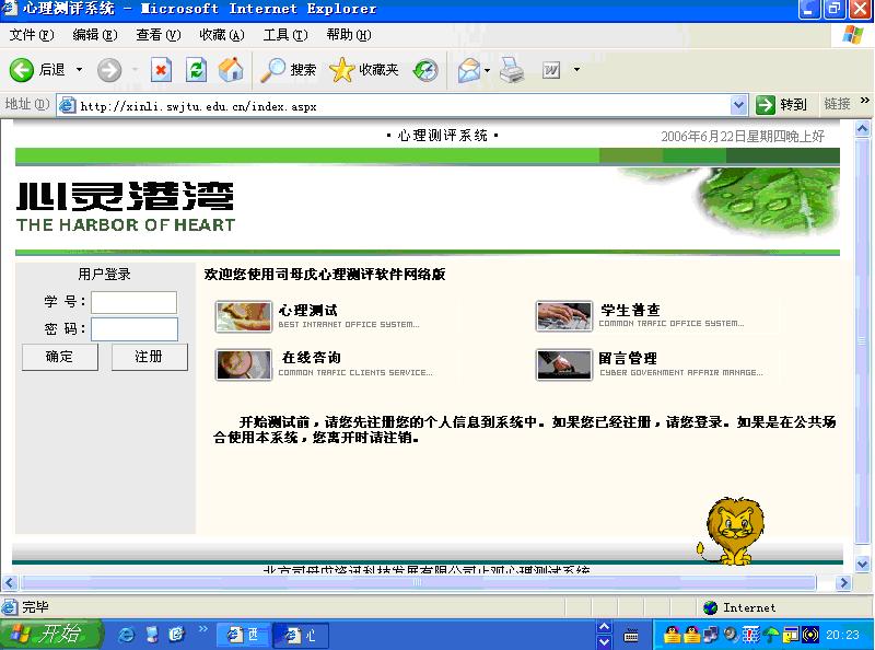 “心力网”在前期建设过程中,部分学生在“专业测评”栏目进行测评后无法得到及时反馈。目前该版块功能已经升级,为了服务于午夜av 师生,我们将提供一个月的义务测评。请大家先注册再登陆进行测评后,到注册时所填邮箱察看结果反馈。在此,我们诚挚地感谢各位的热情参与,并期待“心力网”在各位朋友的关心与支持下,逐渐成长与完善。
