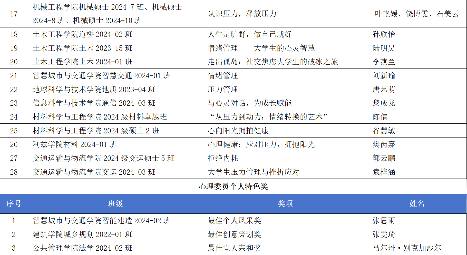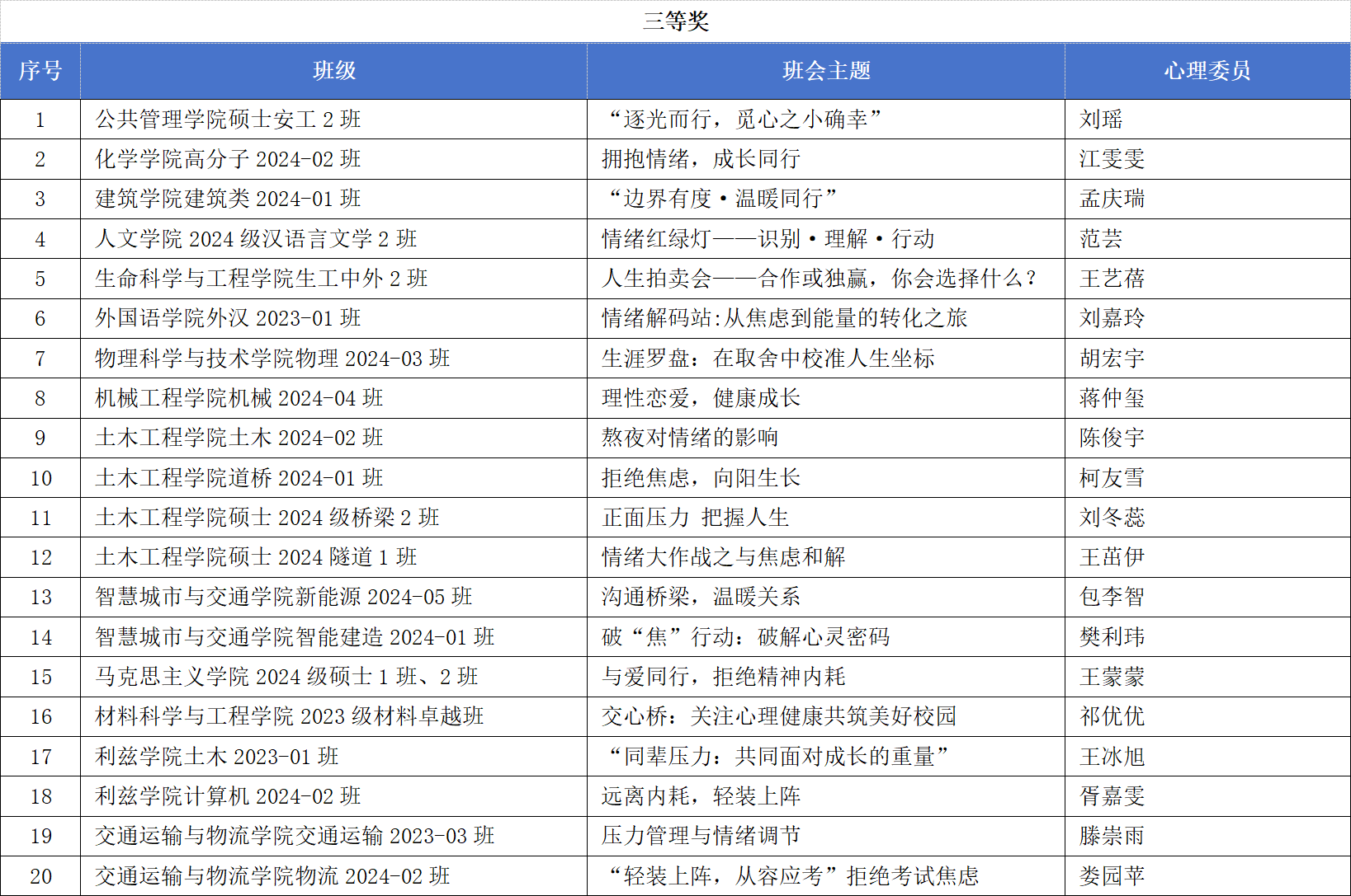 2025年度午夜av “交心桥”心理班会展示会经学院初赛推荐、展示会复赛、决赛,评选出特等奖2项、一等奖3项、二等奖5项、三等奖20项、优秀奖28项以及心理委员个人特色奖3项。现将获奖名单公布如下: