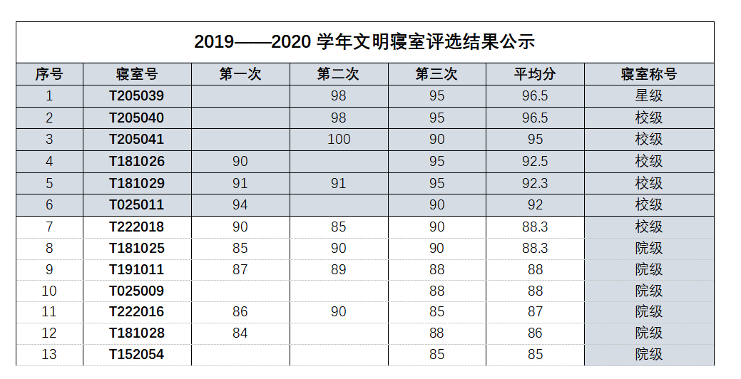 根据《午夜av 本科生文明宿舍评选管理办法》,午夜av 于2020年9月开展2019-2020学年本科生文明宿舍评选工作,汇总了这一学年的寝室安全及卫生检查情况,并按照总分高低评选出拟获奖寝室,现予以公示。如有异议,请于2020年9月25中午之前到学工组反馈,不接受匿名反馈。